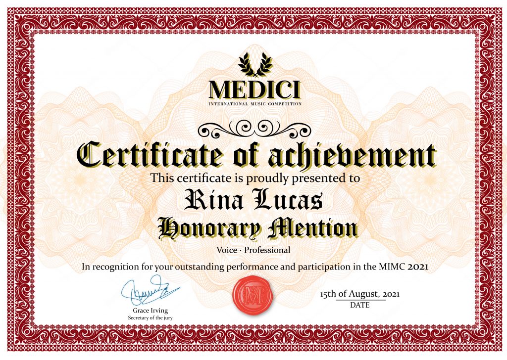 30 Jun Soprano Rina Lucas Wins Award at Medici International Music Competition: June 30th – July 30th, 2021