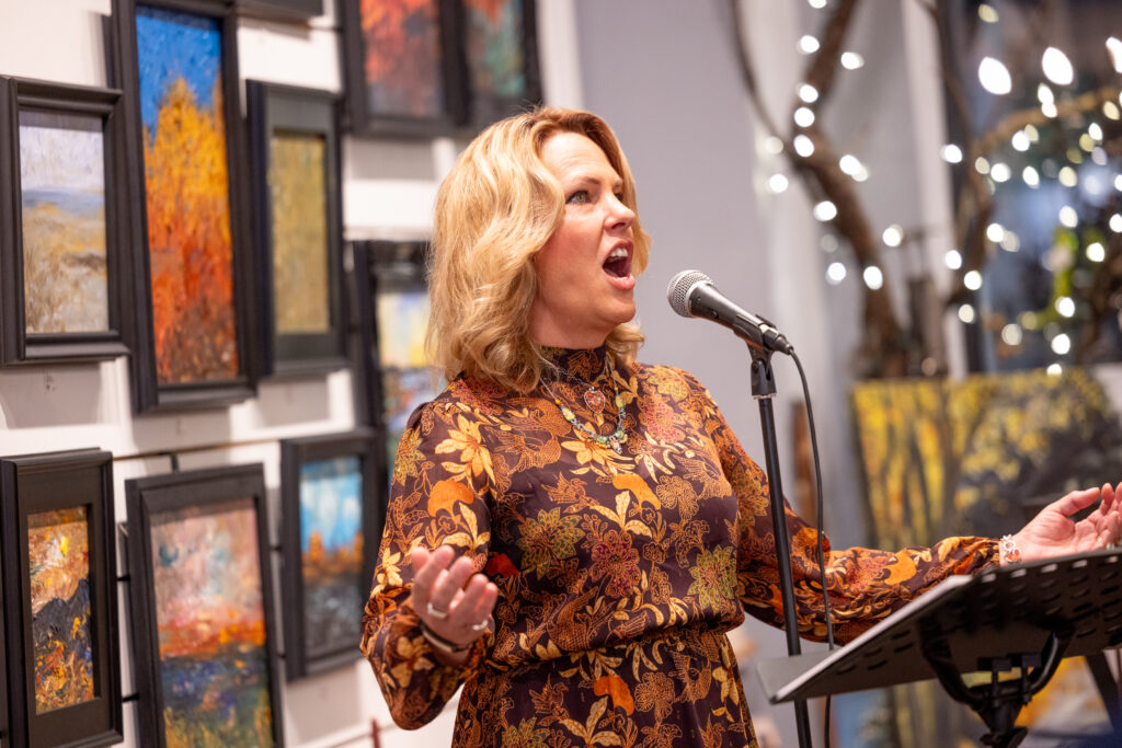 So when I first began to think about this show “Honoring Autumn at Summer’s End”, I wanted to pull together paintings, poetry, and songs that would tell a story. Not just about the time of year we happen to be in, but also for where I am in my life…I think the transition from Summer to Autumn is especially profound, and it’s where my own journey is taking me. Change is never easy. As surely as one season becomes another it’s inevitable that the time comes for letting go of something. Just like the trees releasing their leaves. And that can be painful and frightening. But I find as I have the courage to accept what is, I actually make room for celebrating all that will be. No matter where your life lines up on the calendar, I hope that the images, words, and melodies expressed this evening will meet you personally where you are. All of my paintings on exhibit here are accompanied by poetry, some of which I will share aloud during the program…And the songs, though familiar jazz and blues classics, are arranged by my colleague Arshak Sirunyan and myself. In fact it is his virtual piano accompaniment you will be enjoying tonight as I sing. I sing these tunes to myself as much as to you…as I lament the things I must let go…accept the things I must let be…allowing me to let loose in celebration of all that I am becoming in this moment…