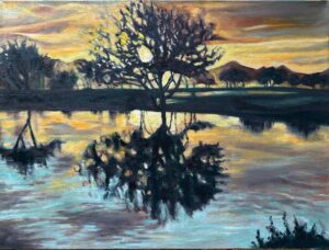 Both the painting and poem seek to represent not only the stunning natural beauty of the Gila River region of Arizona’s Sonoran Desert, but also to tell the story of how devastating non-native agricultural practices in the late 1800’s and early 1900’s literally cut off the life flow of the Gila River to native communities, the Pima (also known as Akimel O’otham) and the Maricopa (also known as the Pee-Posh or Piipaash) who originally cared for this sacred land and remain here to this day. Thirst, experienced often in the desert in a physical way, is expressed here as a longing for truth and for wrongs to be righted. This was the case when the US Government built Coolidge Dam and created the San Carlos Reservoir on the Upper Gila River piping water once again to the reservation to sustain farming practices, life, and hope for the people to whom the land holds most value and rightful claim. The river itself, considered holy by these tribes, is the central character of this multimedia artistic work and also has special meaning for me, literally and metaphorically, in my own personal journey. While each story is as unique as the individuals and groups they represent, the poetic idea stretches to acknowledge the thirst felt by all peoples who have suffered their own violation in some form. It describes how the remedy of the river’s symbolic voiced and visual validation of truth, a mirror to allow for just action, refreshes and alleviates this prayerful longing for the world to be repaired. Value contrast is vigorously implemented in the painting to demonstrate that truth contains complicated shades that show the light and darkness of what is. That the scene is depicted at sunset emphasizes even if restitution is a long time coming, it is never too late to see it done.